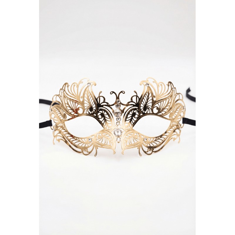 Masque vénitien Greta rigide doré avec strass. Attache par liens.