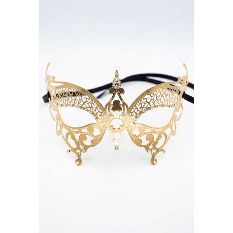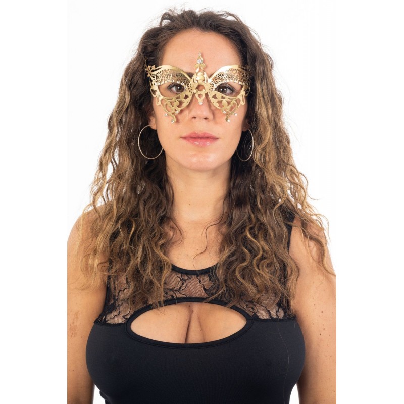 Masque vénitien Alida rigide doré avec strass de votre grossiste Be lily Accessoires, vente en gros et dropshipping de masques vénitiens en métal et strass.