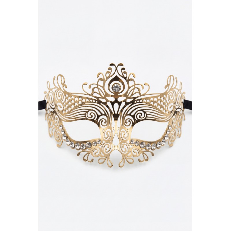 Masque vénitien Ornella rigide doré avec strass. Attache par liens.