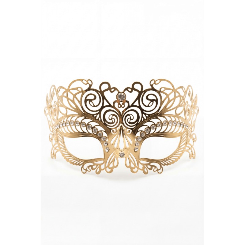 Masque vénitien Giulia rigide doré avec strass. Attache par liens.