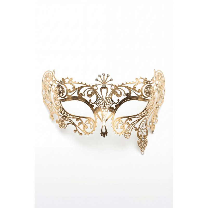 Masque vénitien Bianca rigide doré avec strass. Attache par liens.