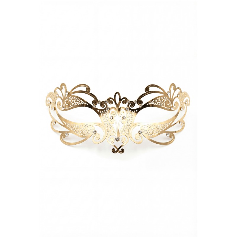 Masque vénitien Gaia rigide doré avec strass. Attache par liens.
