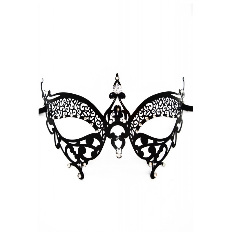 Masque vénitien Alida rigide noir avec strass. Attache par liens. Un masque vénitien haut de gamme pour vos soirées déguisées ou sensuelles / Composition : Métal et strass