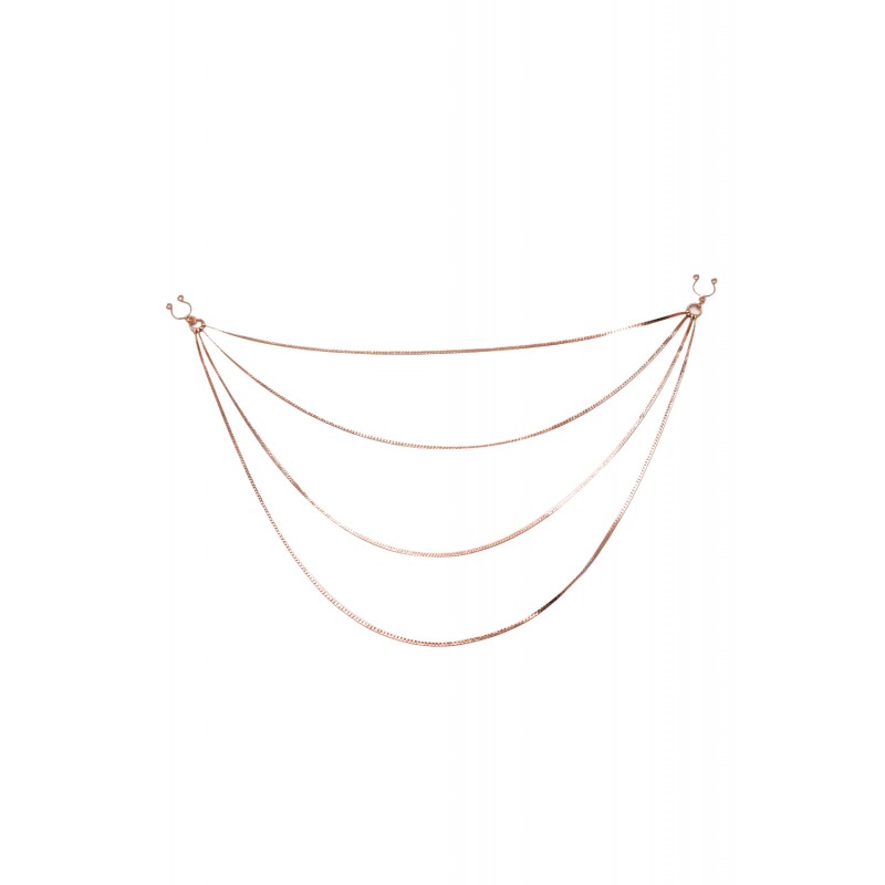 Cette parure de bijoux de corps, composé d'une paires de pinces tétons avec fines chainettes roses dorées, sublimera votre silhouette. Très facile à ajuster sur vos tétons.
