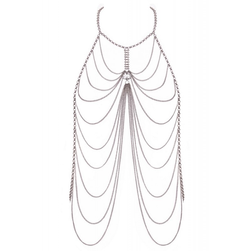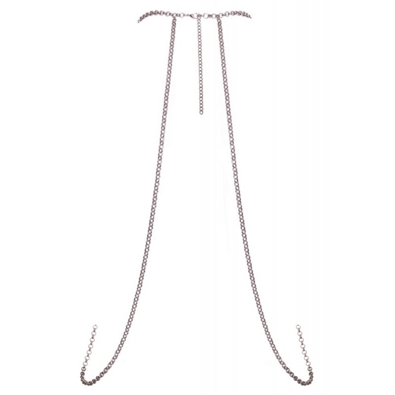 Un look glamour et affirmé, conçu pour capter tous les regards. Cette chaîne de corps argentée séduit par son devant garni de chaînes décoratives, dessinant une ligne sensuelle et élégante sur le buste.