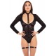 Cet ensemble est composé de son Body noir en dentelle manches longues ainsi que de son harnais ajustable suivant votre silhouette et jarretières noires