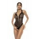 Bodystring noir en tulle transparent orné de séduisants accents de vinyle. laçage sur le devant avec des œillets en nickel pour une touche provocante. Avec un col licou, des côtés réglables et une fermeture à l'entrejambe réglable. Mapalé lingerie rehausse l'attrait de vos moments intimes. -