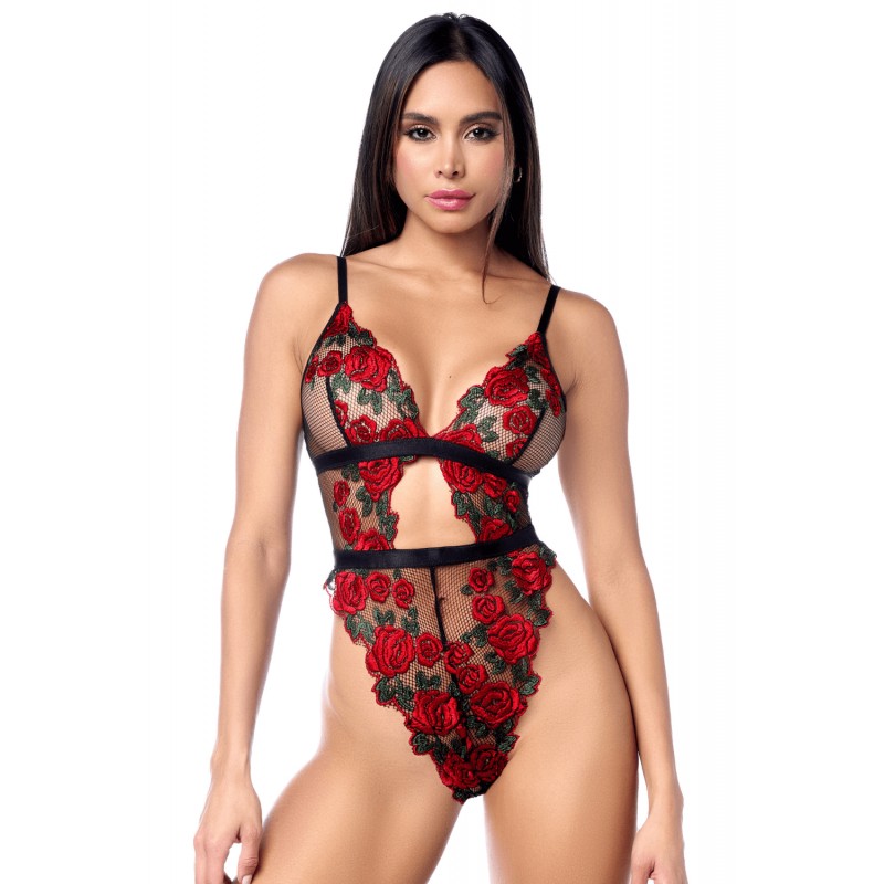 Alliez élégance et audace avec ce teddy sexy taille haute signé Mapalé. Confectionné en résille noire transparente, il est sublimé par une broderie délicate de roses qui ajoute une touche romantique et sensuelle.