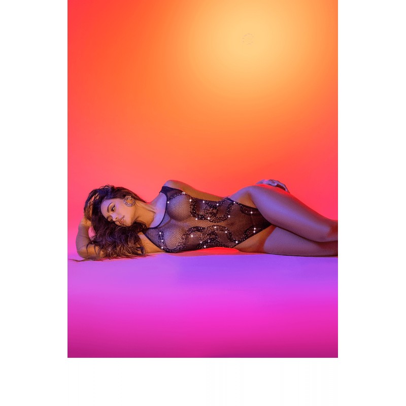 Confectionné en résille noire transparente et extensible, il présente un motif serpent délicatement souligné de strass scintillants, créant un effet lumineux et captivant qui met en valeur les courbes avec précision. Sa coupe près du corps épouse harmonieusement la silhouette, tandis que l’ouverture à l’entrejambe apporte une touche audacieuse et assumée au design.