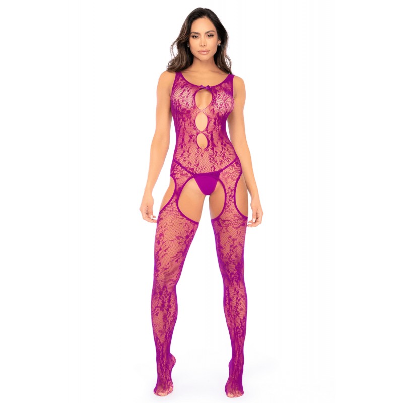 Confectionnée en résille florale couleur orchidée, elle enveloppe le corps d’un motif travaillé et délicat, tout en offrant une transparence raffinée.