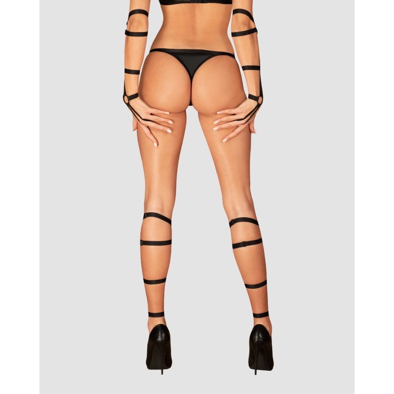 Dès que vous enfilez ce harnais noir, vous sentez l'air s'électriser à chacun de vos mouvements. Toute l'attention est portée sur vous. Les lanières de tissu reliées entre elles de manière intrigante affineront vos jambes et accentueront leur beauté. Préparez-vous à des moments de plaisir !