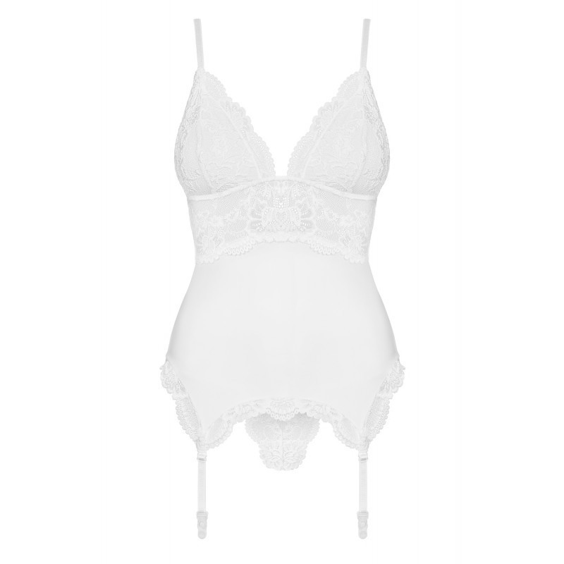 Vous allez devenir une bombe, oui c'est le mot, avec cette superbe guêpière blanche d'un tissu extensible et moulant. Les bonnets sont avec un rembourrage pour le confort et la beauté des seins et bretelles réglables. Une jolie bande de dentelle blanche transparente se trouve sous la poitrine et sublime le dos.De très belle finition pour cette guêpière à laquelle vous pouvez y ajouter des bas non inclus grâce aux jarretelles réglables. Le string blanc avec de la dentelle est compris.