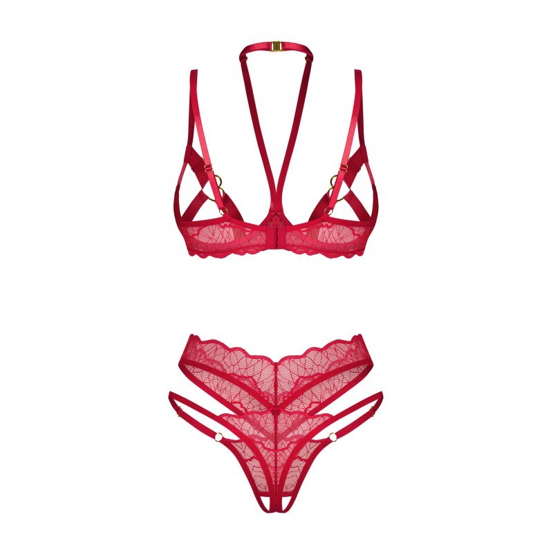 Parfait pour un look audacieux, cet ensemble de lingerie rouge est doté d’un soutien-gorge ouvert et d’un string ouvert assorti. Bretelles élastiques, dentelle délicate et accents dorés étincelants ajoutent une touche élégante. Avec ses bretelles larges et réglables et sa fermeture multi-crochet sécurisée, cet ensemble offre à la fois confort et charme.