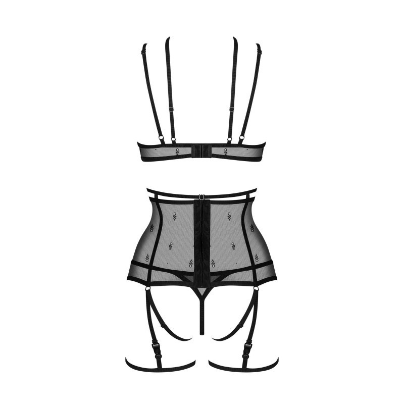 Cet ensemble coquet comprend un large porte-jarretelles, jarretières détachables, string et soutien-gorge. La combinaison intrigante de matériaux légers mettra parfaitement en valeur la confiance en soi féminine.