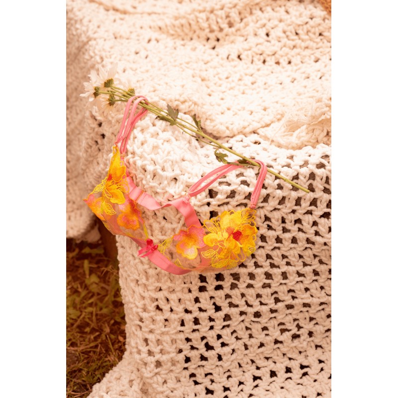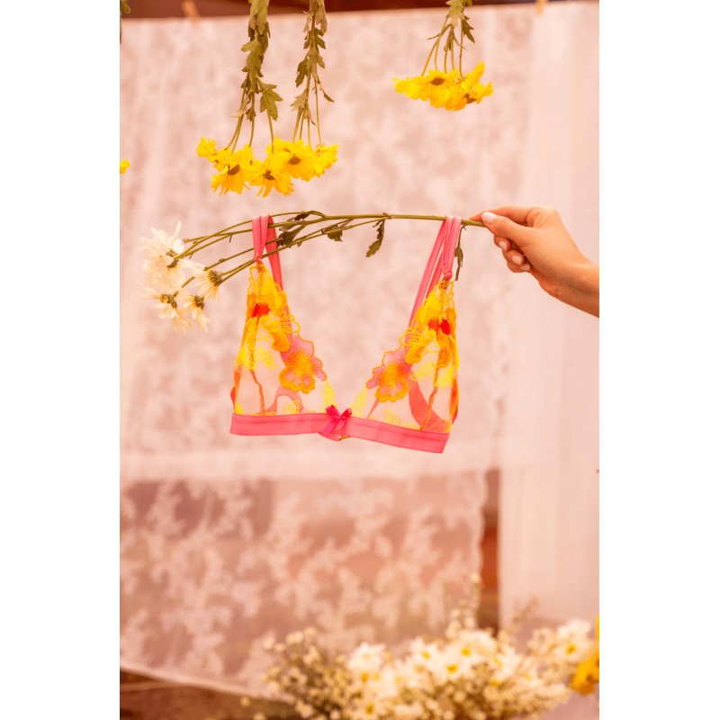 Ensemble lingerie rose et jaune en maille transparente signé Mapalé. Ce modèle associe des teintes lumineuses à une broderie florale délicate, apportant une touche à la fois romantique et moderne.