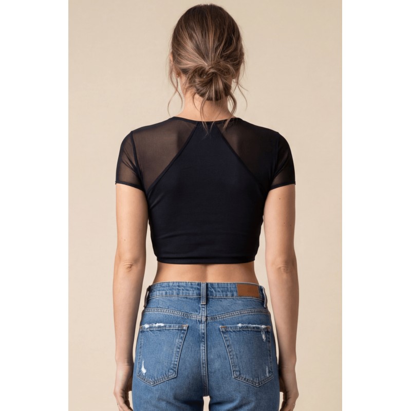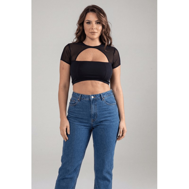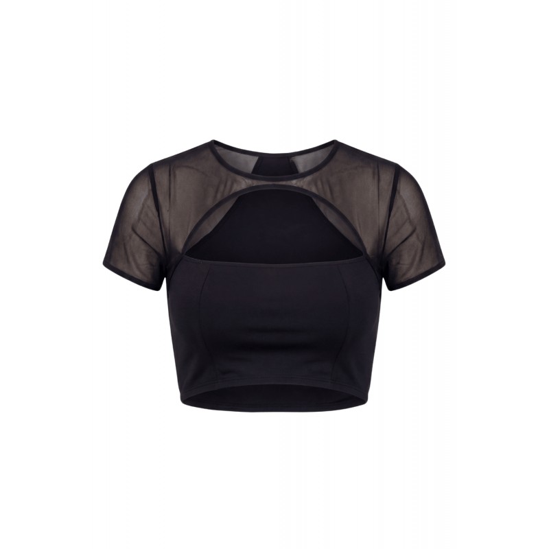 Top noir sexy dans un tissu élastique et fine résille qui épousera parfaitement votre silhouette. Ouverture sur le haut de la poitrine et épaules en fine résille. A porter avec une jupe de la collection Be Lily.