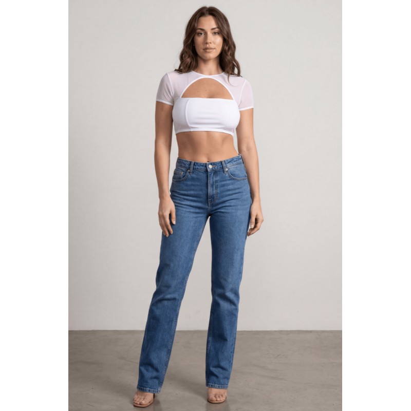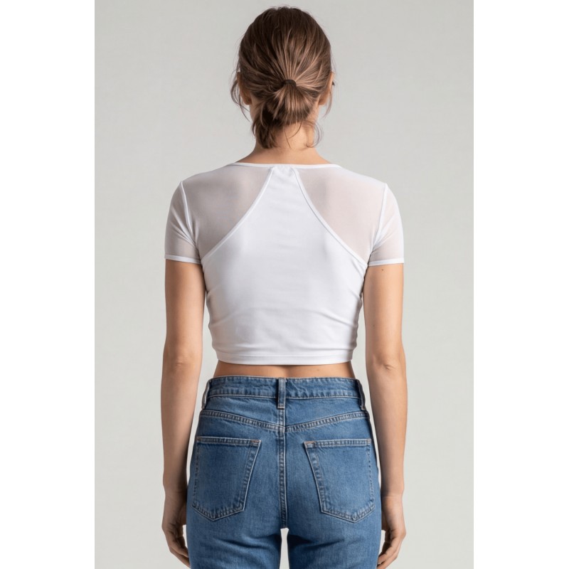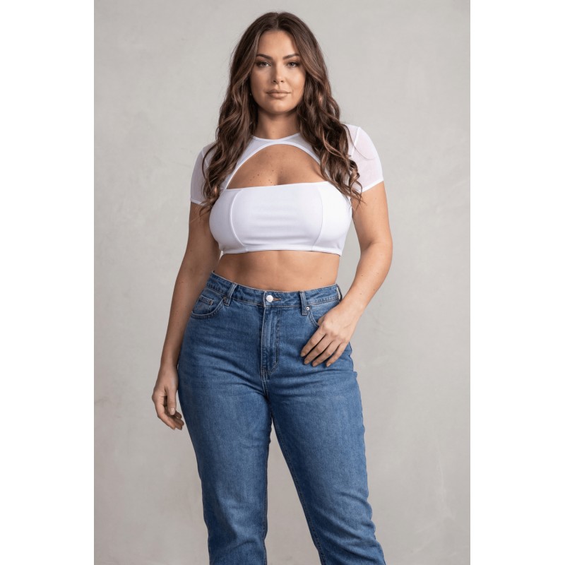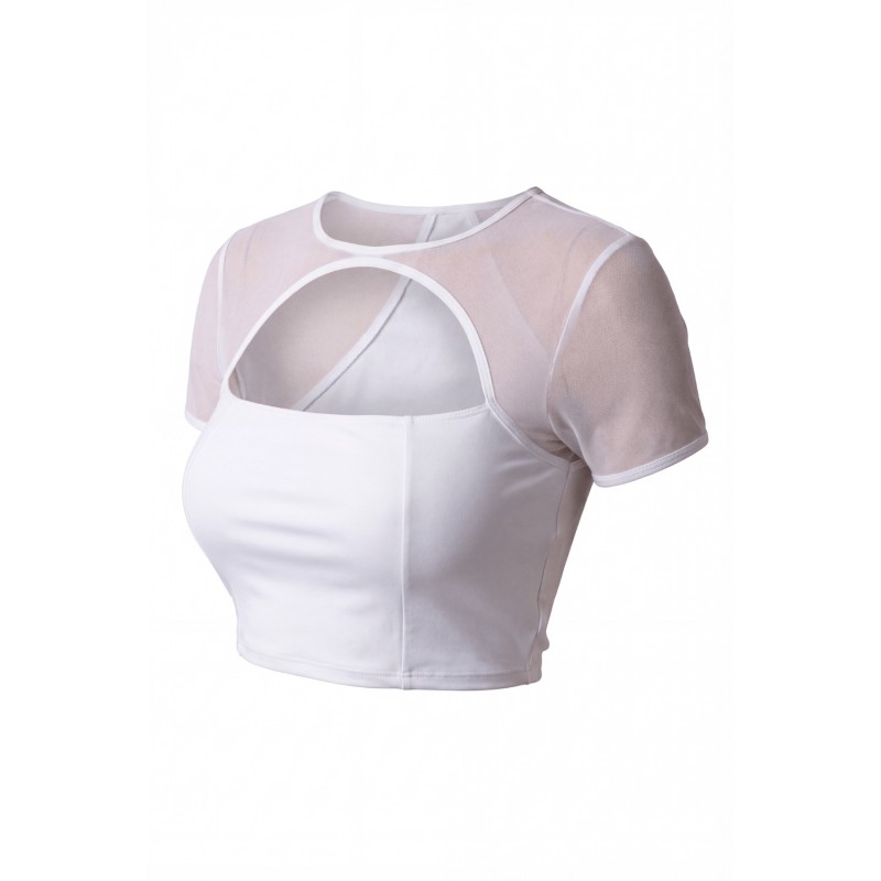 Top blanc sexy dans un tissu élastique et fine résille qui épousera parfaitement votre silhouette. Ouverture sur le haut de la poitrine et épaules en fine résille. A porter avec une jupe de la collection Be Lily.