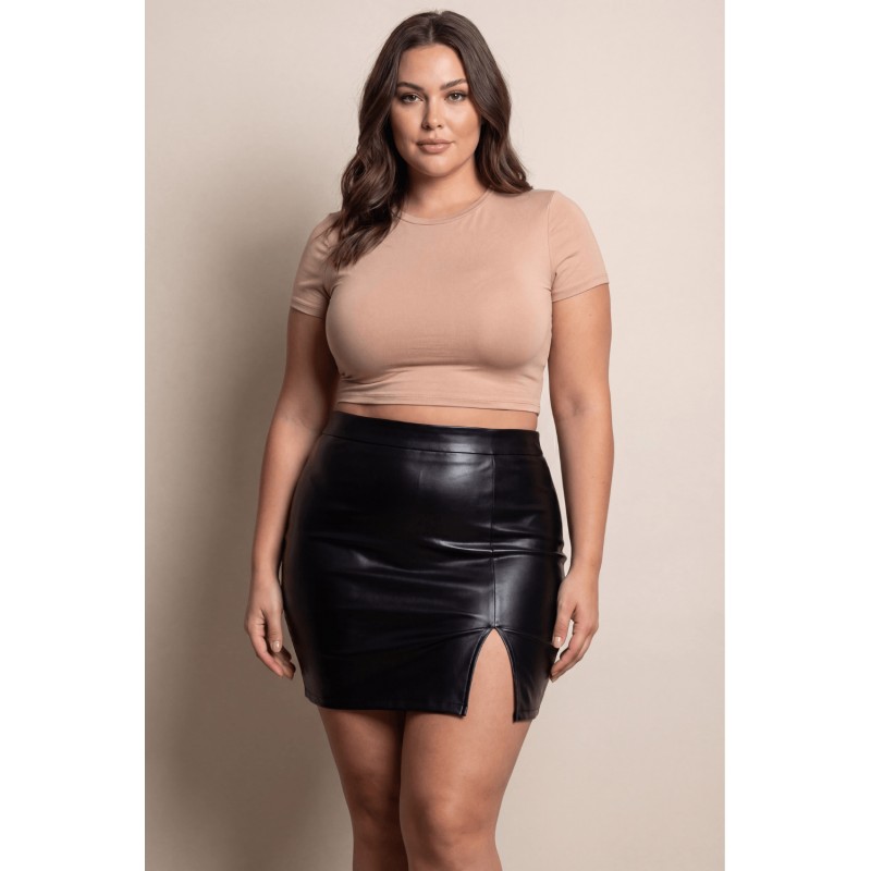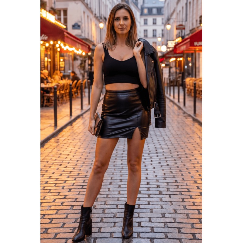 So Sexy la Jupe Alessia de la collection Be Lily . Jupe courte en simili cuir avec zip sur l'arrière. Tissu extensible et léger .