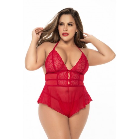Body rouge, grande taille, dans un style babydoll avec attaches dans le dos, laçage autour du cou et string assorti inclus.