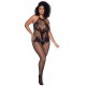 Sublimez vos courbes avec cette combinaison grande taille en résille noire qui épouse parfaitement le corps. Ornée de motifs floraux stratégiquement placés à l'avant, elle met en valeur la silhouette avec sensualité. Son dos échancré ajoute une touche encore plus audacieuse, tandis que sa coupe ouverte à l’entrejambe promet un confort et un charme irrésistibles.