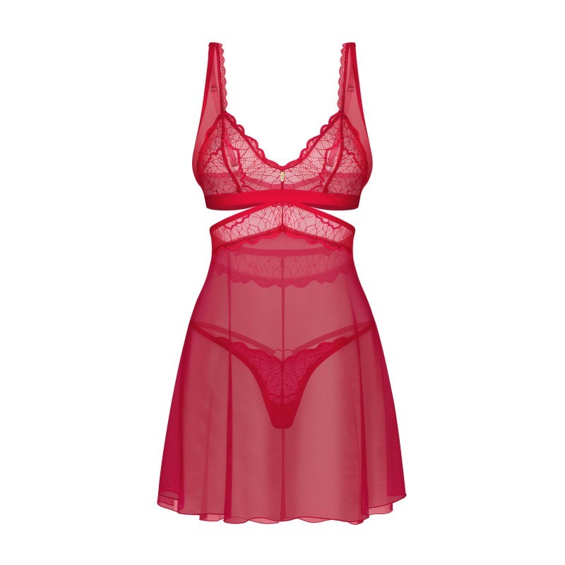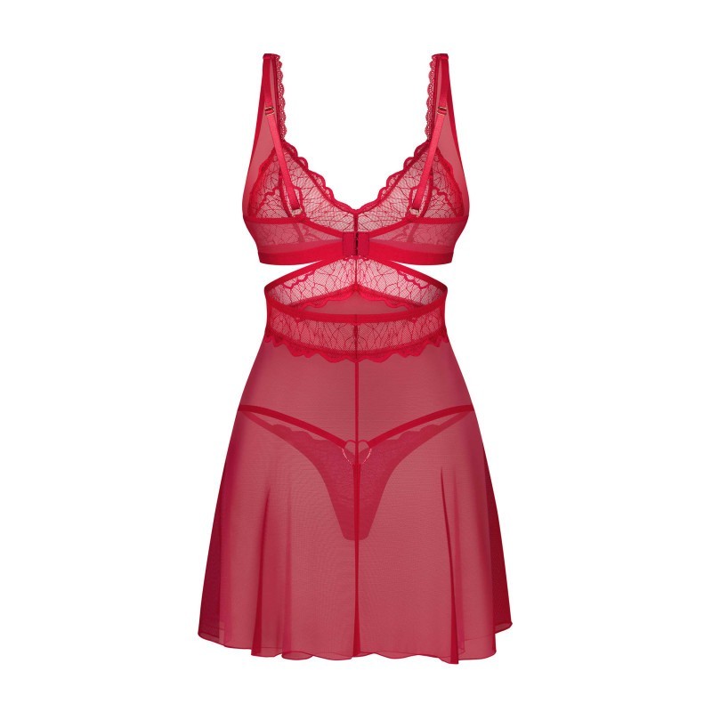 Cette robe courte et rouge séduit par ses accents de dentelle et son tissu aéré et transparent qui coule à merveille. Des bretelles réglables et une fermeture à plusieurs crochets offrent un confort tout au long de la journée, tandis que l’ensemble est complété par un string classique pour un look parfaitement assorti.