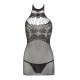 Magnifique petite robe en résille noire, très élastique et sans couture, qui épousera parfaitement votre silhouette. Col ras le cou tissé avec dos nu. Petite dentelle sur la poitrine et le dos. Le string en dentelle est inclus.