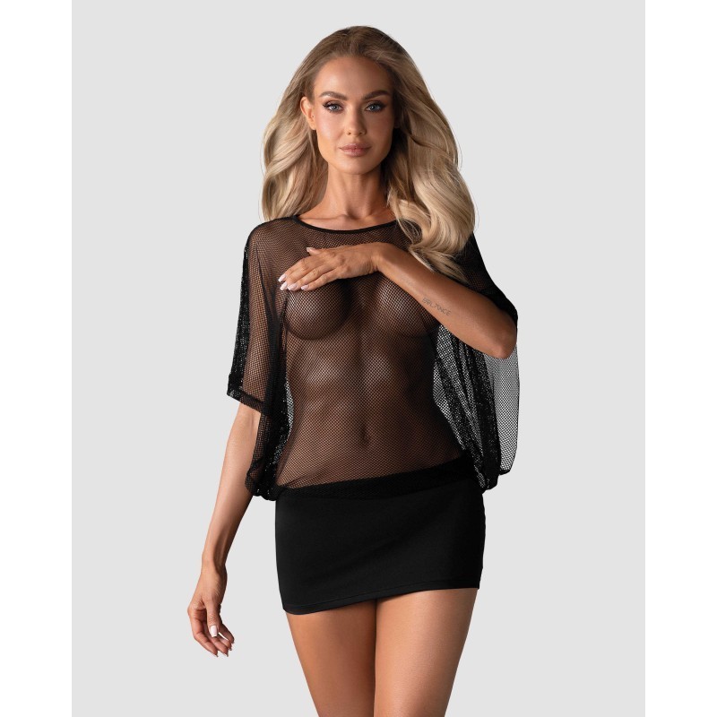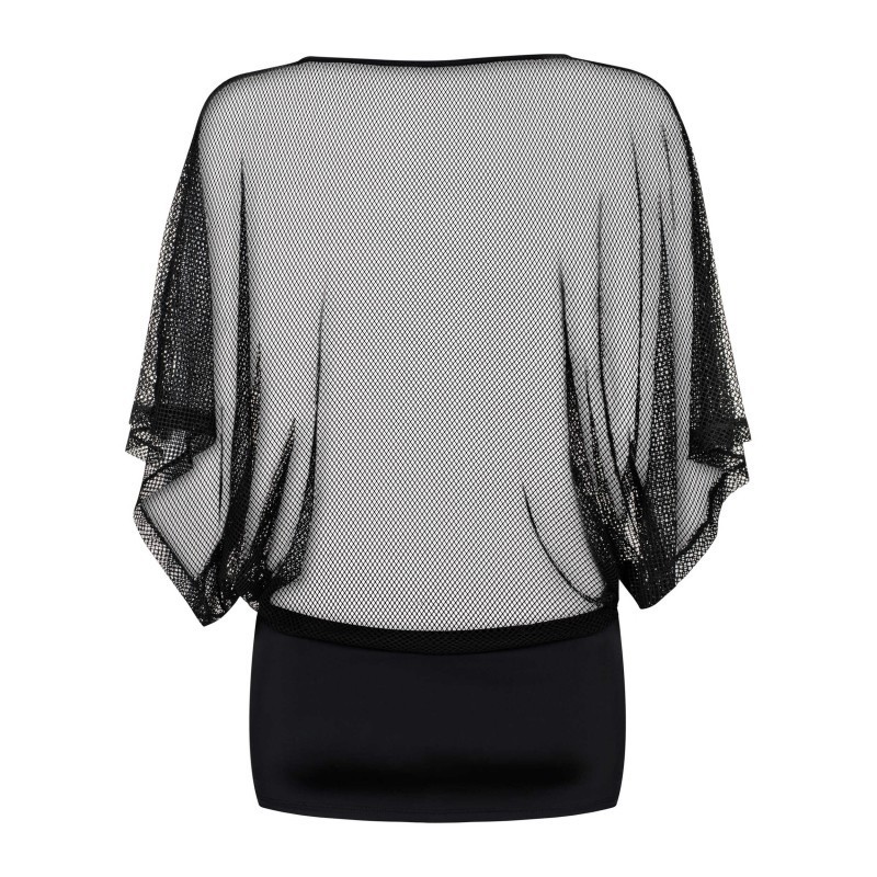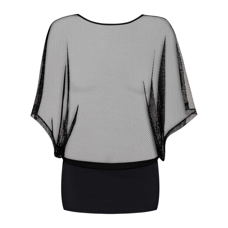 Mini-robe frivole, sexy ! Haut séduisant et mini-jupe. Faut transparent avec de larges manches. Mini-jupe faite de tissu agréable et flexible. De même matière que le haut.. String sexy inclus. Composition : 90 % de Polyamide, 10 % d'Élasthanne