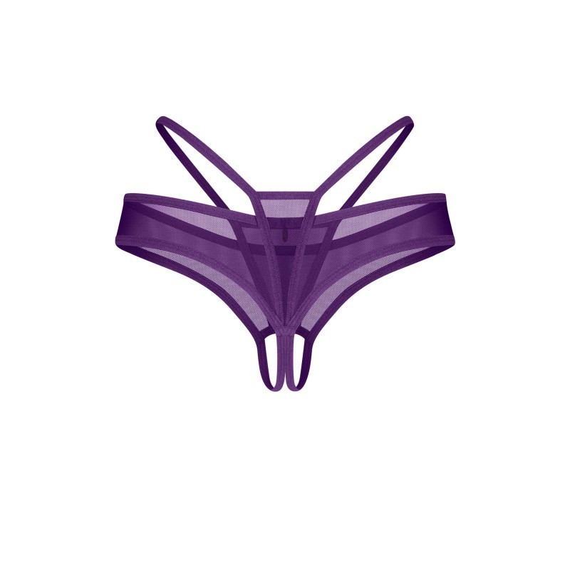 String violet ouvert en maille transparente dans une teinte audacieuse et vibrante. Le design à lanières accentue les hanches et l’arrière, tandis qu’un charme argenté à l’avant ajoute un détail subtil mais frappant.