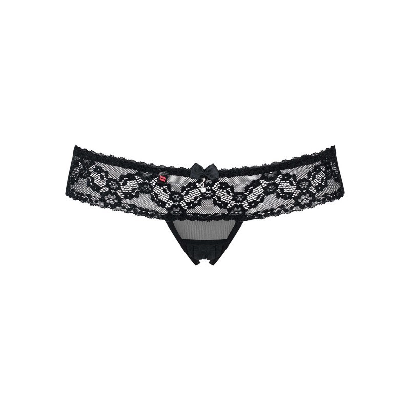 Un superbe string noir ouvert, avec une combinaison de dentelle et de maille transparente. Un noeud et bijou brillant sont présents pour plus de charme. 94% Polyamide, 6% Elasthanne