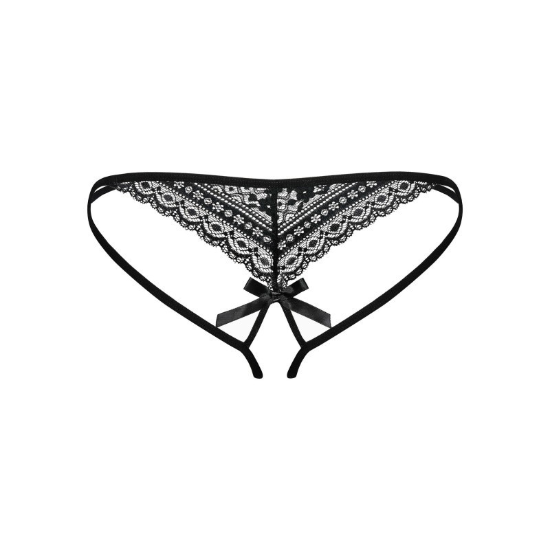 Délicieux string ouvert de la marque de lingerie sexy Obsessive. Ce string dentelle possède des charmes exceptionnels avec des ornements de haute qualité. Les bandes élastiques viennent se rejoindre sur les fesses pour former un joli dessin sublimé d'un noeud satin.