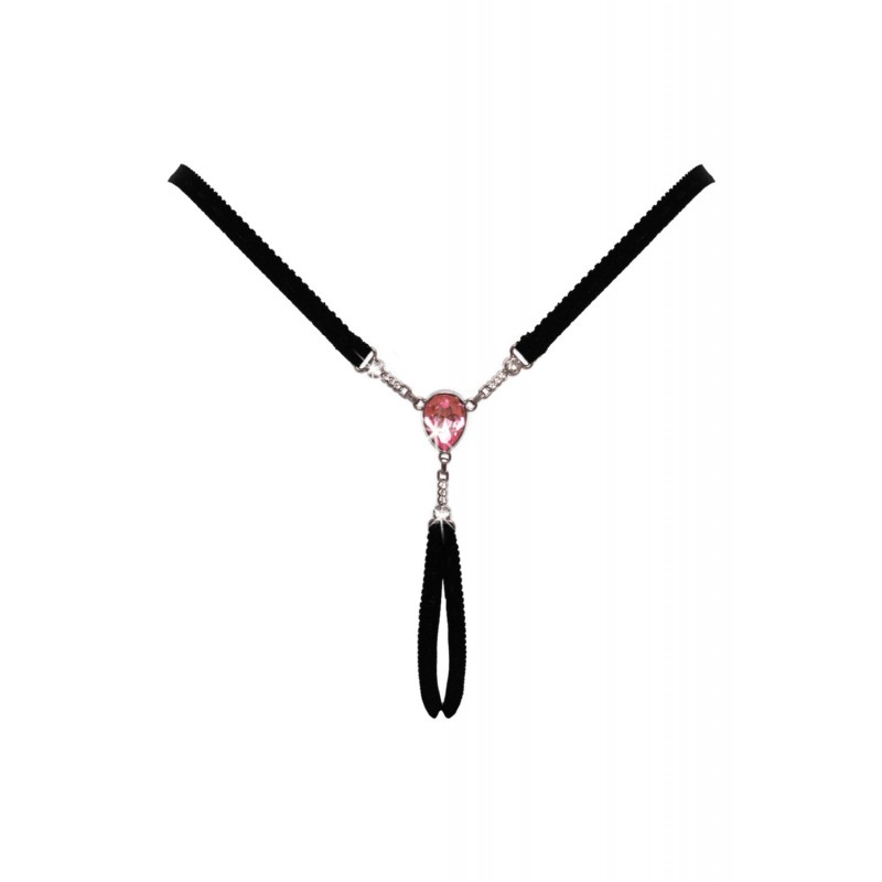 À l’avant, une grande pierre décorative rose attire le regard, accompagnée de chaînettes argentées ornées de petites pierres scintillantes pour une finition élégante et sensuelle.